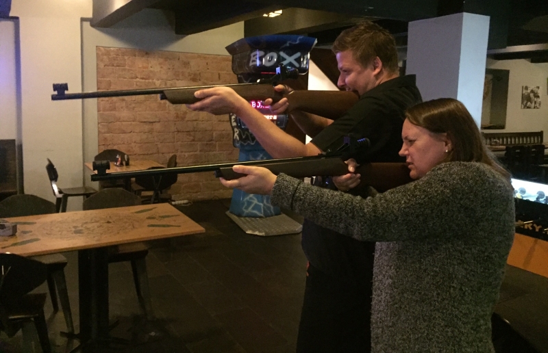 Biatlonová laserová střelnice, pobaví bezpečně hosty vašeho večírku. Střílet se dá i venku, moderní senzory tuto střelnici nijak neomezují. Jsou použity nejnovější technologie. Na vašem večírku si mohou hosté vyzkoušet bezpečnou střelbu jednoho z nejoblíbenějších sportovních odvětví. Hosté mohou udělat 10 dřepů, nebo kliků, nebo prostě jen tak si vyzkoušet, za jak dlouho se jim podaří zasáhnout terč.